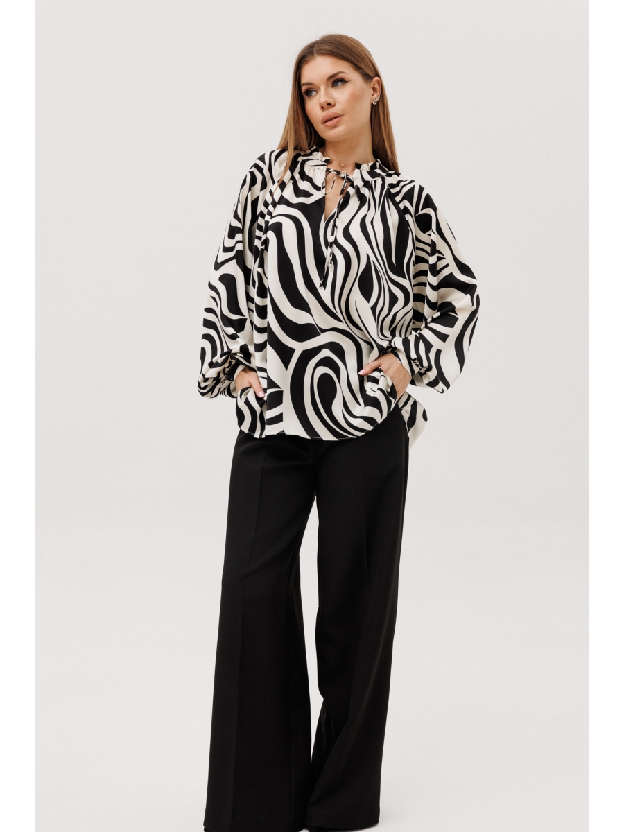 Блузка свободного силуэта (стиль оверсайз) с рукавом реглан. Горловина с разрезом спереди и притачной планкой с рюшей. Рукав на манжете. Модель без подкладки, не просвечивает.