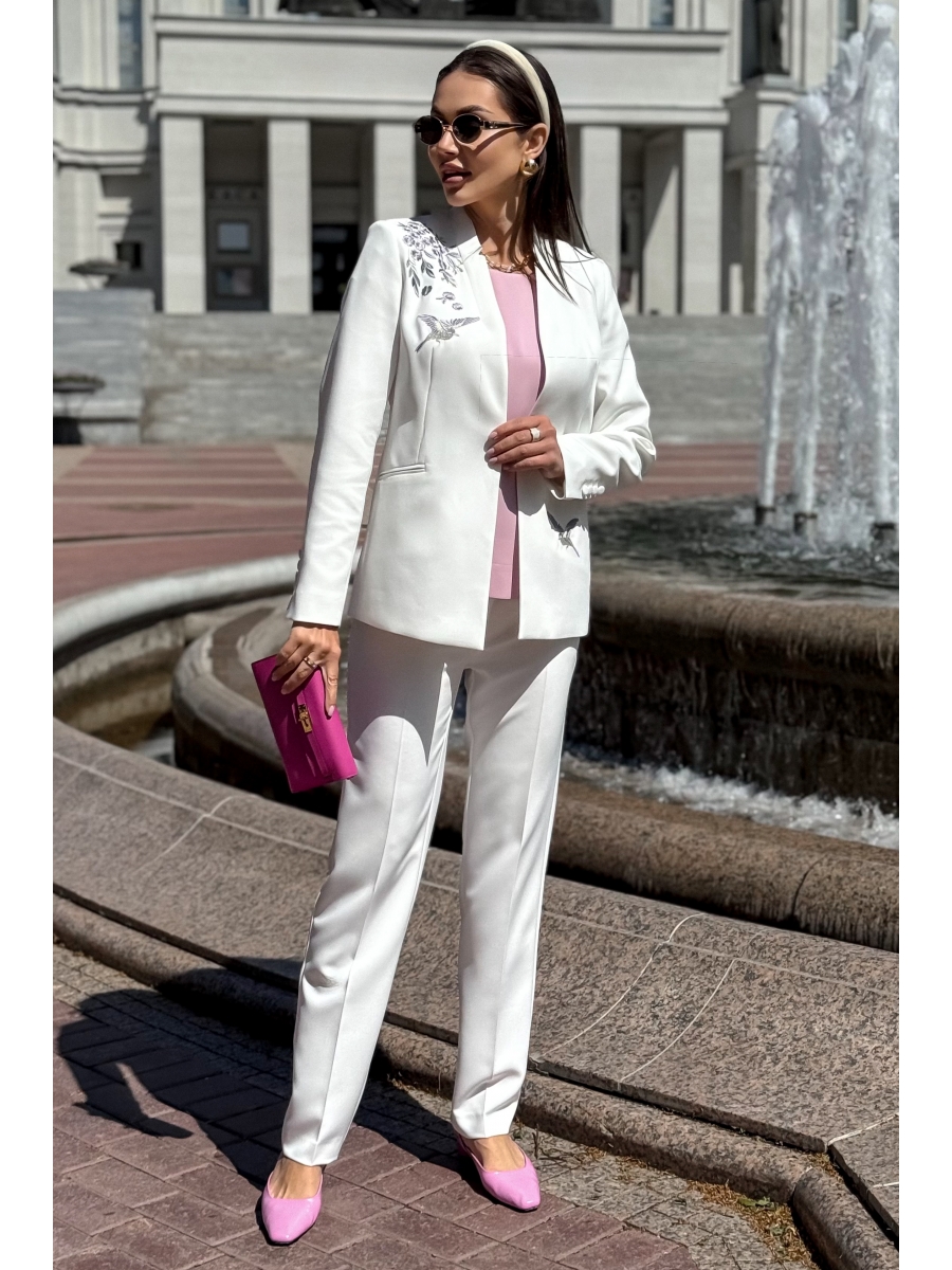 Откройте для себя утонченную классику в современной интерпретации — женский брючный костюм с жакетом, блузой и брюками. Элегантный жакет украшен изысканной вышивкой, что придаёт образу лёгкость, изящество и нотку романтики.