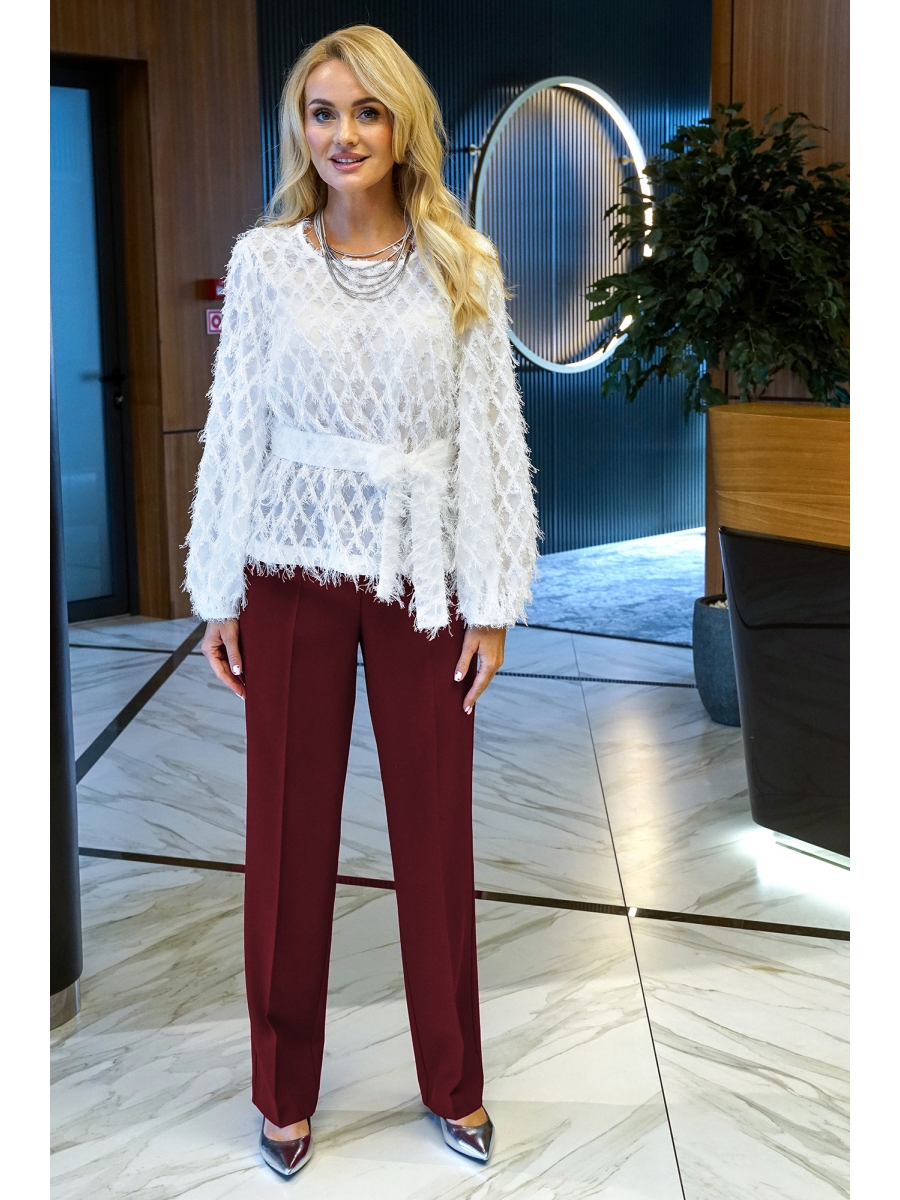 Блуза прямого силуэта, с поясом, с разрезом по среднему шву спинки и застёжкой на навесную петлю и пуговицу. Перед с нагрудными выточками. Рукава втачные, одношовные, длинные, понизу на резинке.