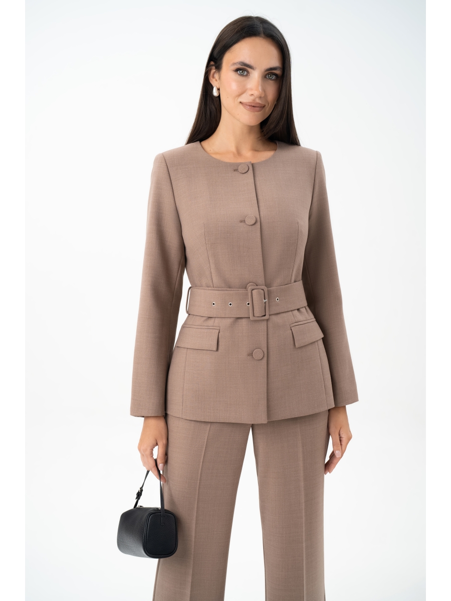 Костюм женский двухпредметный из костюмной ткани, состоит из жакета полуприлегающего силуэта на подкладке и прямых брюк со стрелками. В комплект к костюму идет съемный застегивающийся пояс с пряжкой. Костюм предназначен для повседневной носки.