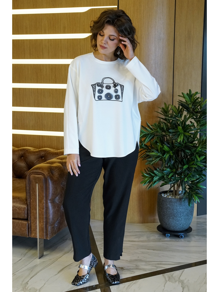 Блузон прямого, свободного силуэта, боковые части переда и спинки с цельнокроеными, длинными рукавами, с фигурной линией низа. С бейкой по горловине. Декорирован аппликацией «вышивка» и отделочными деталями со стразами.