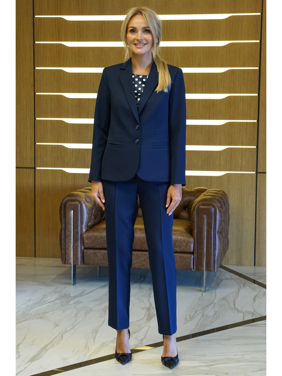 Жакет женский полуприлегающего силуэта, на подкладке, отрезной по линии талии, с отложными лацканами, с застёжкой на две петли и пуговицы. Перед верхняя часть с рельефными швами по боковым частям с конструктивным подрезом, по нижней части прорезные карманы с двумя обтачками. Спинка со средним швом, по верхней части с рельефными швами. Рукава двухшовные, длинные. Воротник отложной с отворотом.
