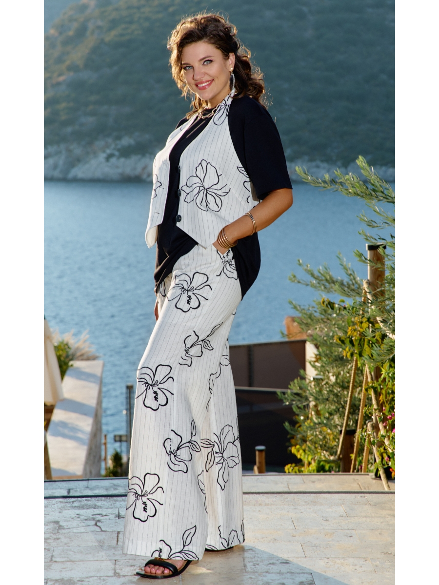 Эффектный летний комплект, трёх-предметный, состоящий из льняной жилетки, блузы глубокого черного цвета и белых льняных брюк, украшенных изысканными черными полосками, пересекающимися с очаровательными цветами. Этот летний наряд идеально уместен как на вечерней прогулке по набережной, так и на встрече с друзьями в кафе. Прогулка в таком наряде принесет вам не только ощущение комфорта, но и уверенность в собственной неотразимости.