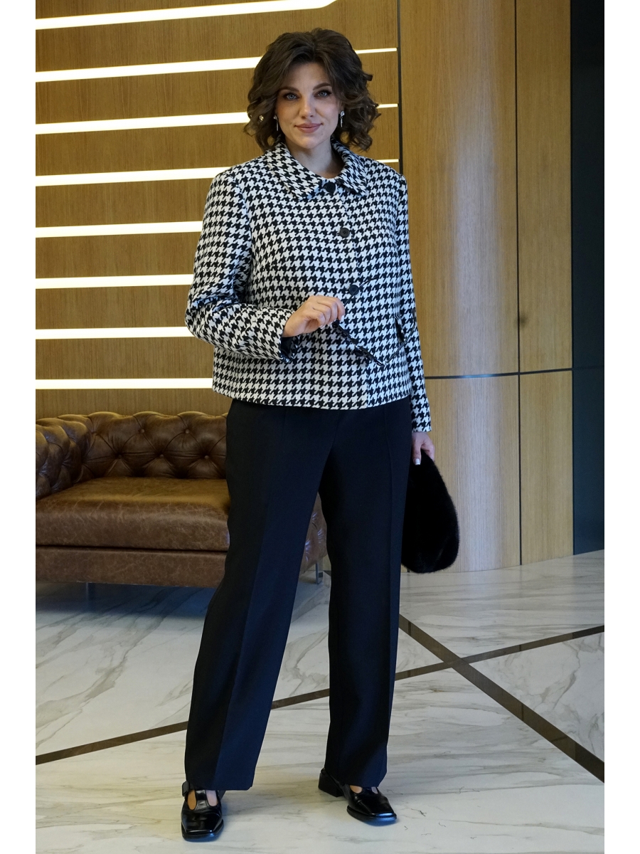 Жакет прямого силуэта, на подкладке, с застёжкой на петли, пуговицы. Перед с нагрудными выточками, прорезными карманами. Рукава втачные, двухновные. Воротник отложной.