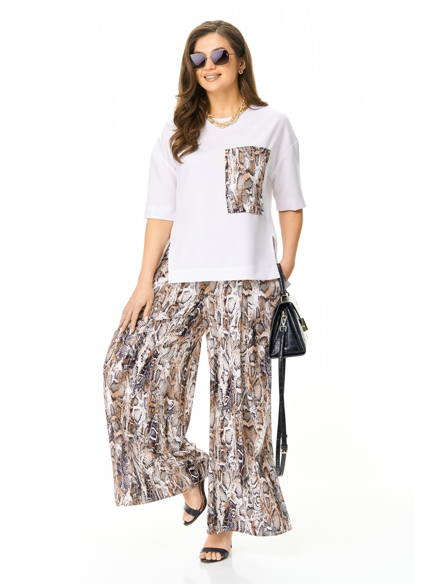Состоит из брюк палаццо и блузона прямого силуэта, с интересным карманом в цвет брюк, со спущенной проймой, что придает свободу движению и комфорта при носке. Сзади двойная кокетка.