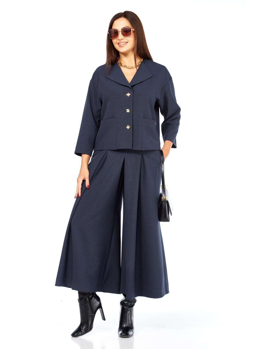 Очень стильный, элегантный, модный женский комплект, состоит из юбки-брюк (кюлоты) и жакета, с интересным воротником, с дорогой фурнитурой, накладными карманами с лейбой золотистого цвета.