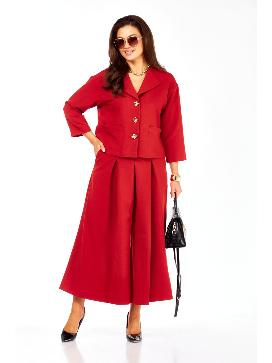 Очень стильный, элегантный, модный женский комплект, состоит из юбки-брюк (кюлоты) и жакета, с интересным воротником, с дорогой фурнитурой, накладными карманами с лейбой золотистого цвета. Очень интересный фасон кюлот, с хорошей посадкой, с первого взгляда похожи на юбку. Пояс со шлевками и на резинке сзади.