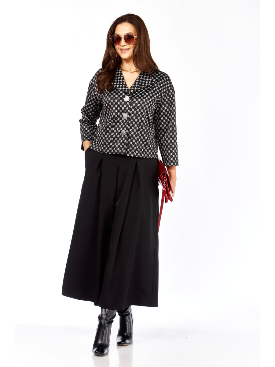 Очень стильный, элегантный, модный женский комплект, состоит из юбки-брюк (кюлоты) и жакета, с интересным воротником, с дорогой фурнитурой, накладными карманами с лейбой золотистого цвета.