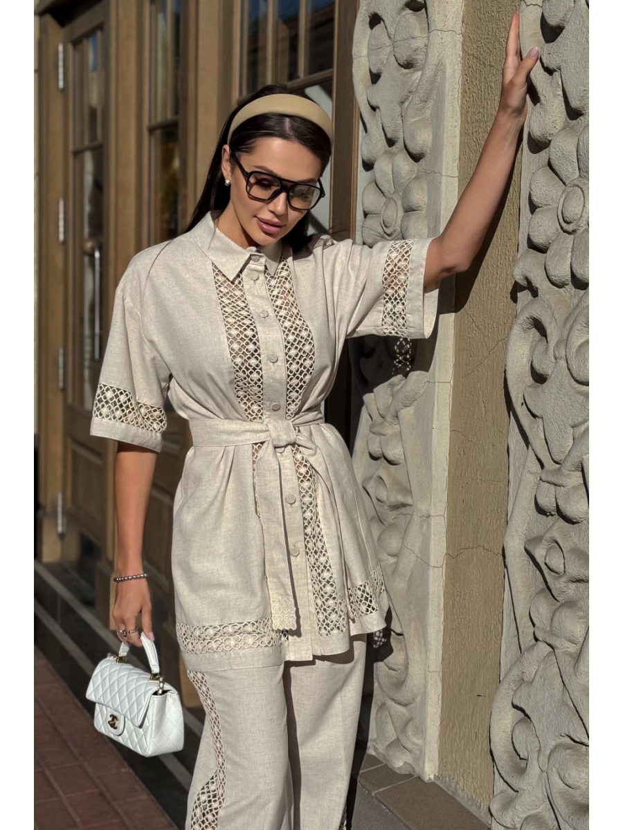 Костюм женский, состоящий из блузки, съемного пояса и брюк, выполненных из льняной ткани в сочетании с кружевом.