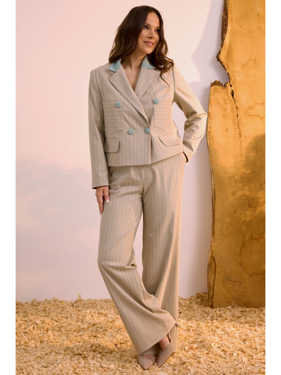 Жакет двубортный прямого кроя, на подкладке, слегка укорочен. Классический воротник и застежка на пуговицы создают стильный и универсальный силуэт, который легко комбинируется как с брюками прямого кроя, так и с юбкой. Рукав втачной. Жакет дополнен отделкой из рогожки бирюзового цвета, что придает образу уникальность.