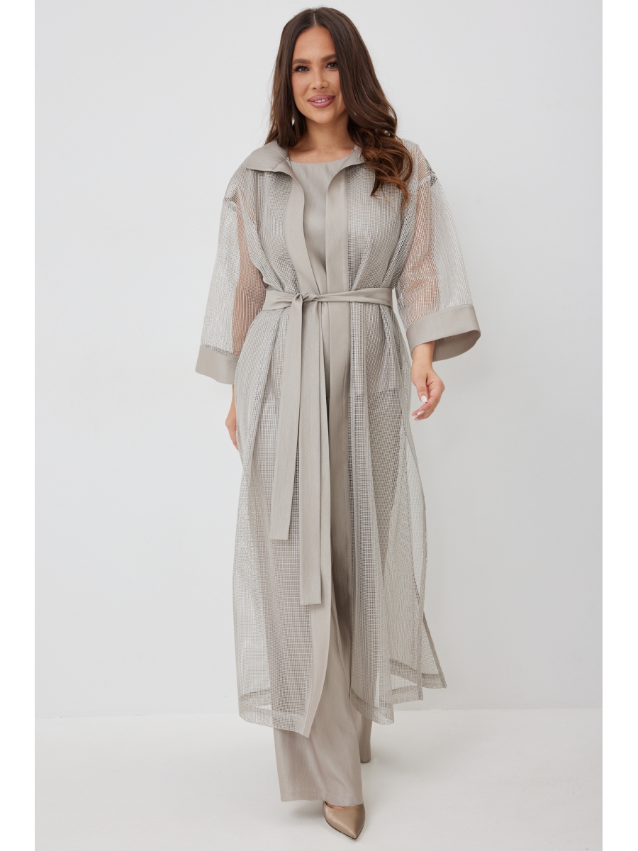 Кардиган свободного прямого кроя с разрезами. Выполнен из текстильной сетки с отделкой из гладкой костюмной ткани. Рукав втачной, слегка спущен. Дополнен съемным поясом.