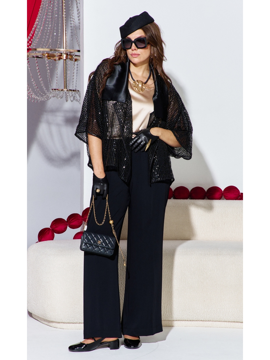 Жакет продолжает линию плеча и свободно свисает до середины бедра, образуя мягкую, расслабленную форму. Это не просто вещь, а диалог материалов: матовая глубина сетки и искрящийся блеск пайеток соединяются с атласным воротником, создавая ансамбль, который легко адаптируется под вечерний выход. Жакет «оверсайз» силуэта с ассиметричной линией борта, отложным воротником из отделочной ткани. Линия плеча в жакете спущенная. Рукав втачной, длиной ¾. Спинка без особенностей. Жакет на подкладке.