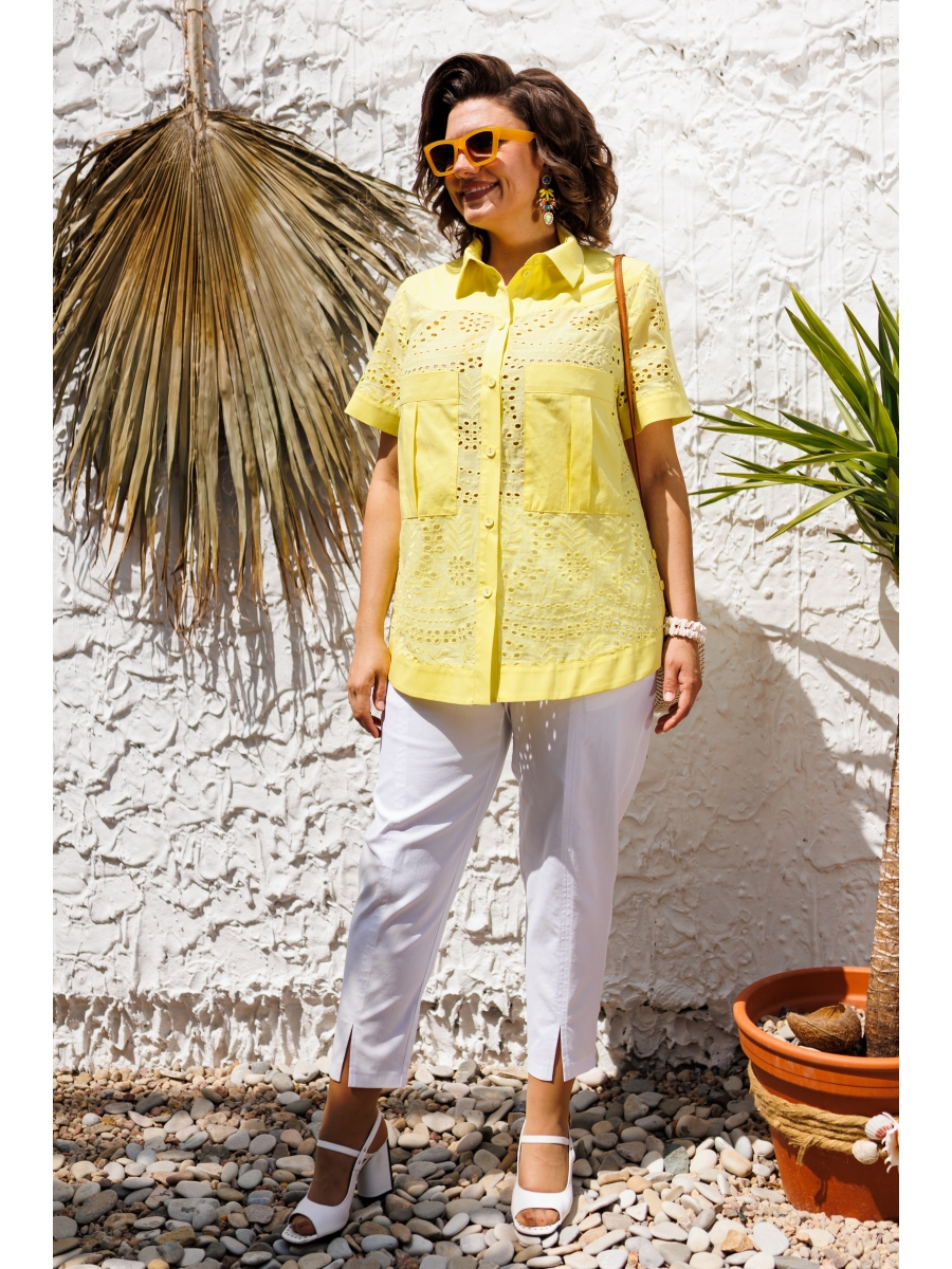 Блузка женская, прямого силуэта, длиной ниже линии бёдер с фигурным низом. Перед с 2-мя отрезными кокетками, с 2-мя нагрудными вытачками, с 2-мя накладными прямоугольными карманами с бантовой зафиксированной складкой по центру кармана, карманы расположены на уровне линии груди; с 2-мя приточными вертикальными планками. Спинка с отрезной кокеткой. Боковой шов с надстрочной планкой, декорированной 2-мя пришивными пуговицами. Кокетка переда, накладные карманы, планка переда, кокетка спинки, планка бокового шва, выполнены из отделочной ткани. Низ блузки с приточной, обтачной планкой из отделочной ткани. Горловина круглая с втачным воротником с отрезной стойкой, воротник и стойка из отделочной ткани. Застёжка центральная на 7-мь обмётанных петель пришивных пуговиц.