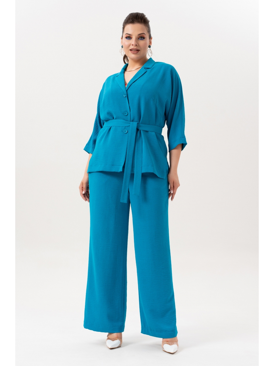 Модный современный жакет с воротником пиджачного пита, с центральной бортовой застёжкой на 3 петли и 3 пуговицы, полочка с нагрудной вытачкой, с разрезами по бокам. Жакет со съёмным поясом. Спинка цельная.