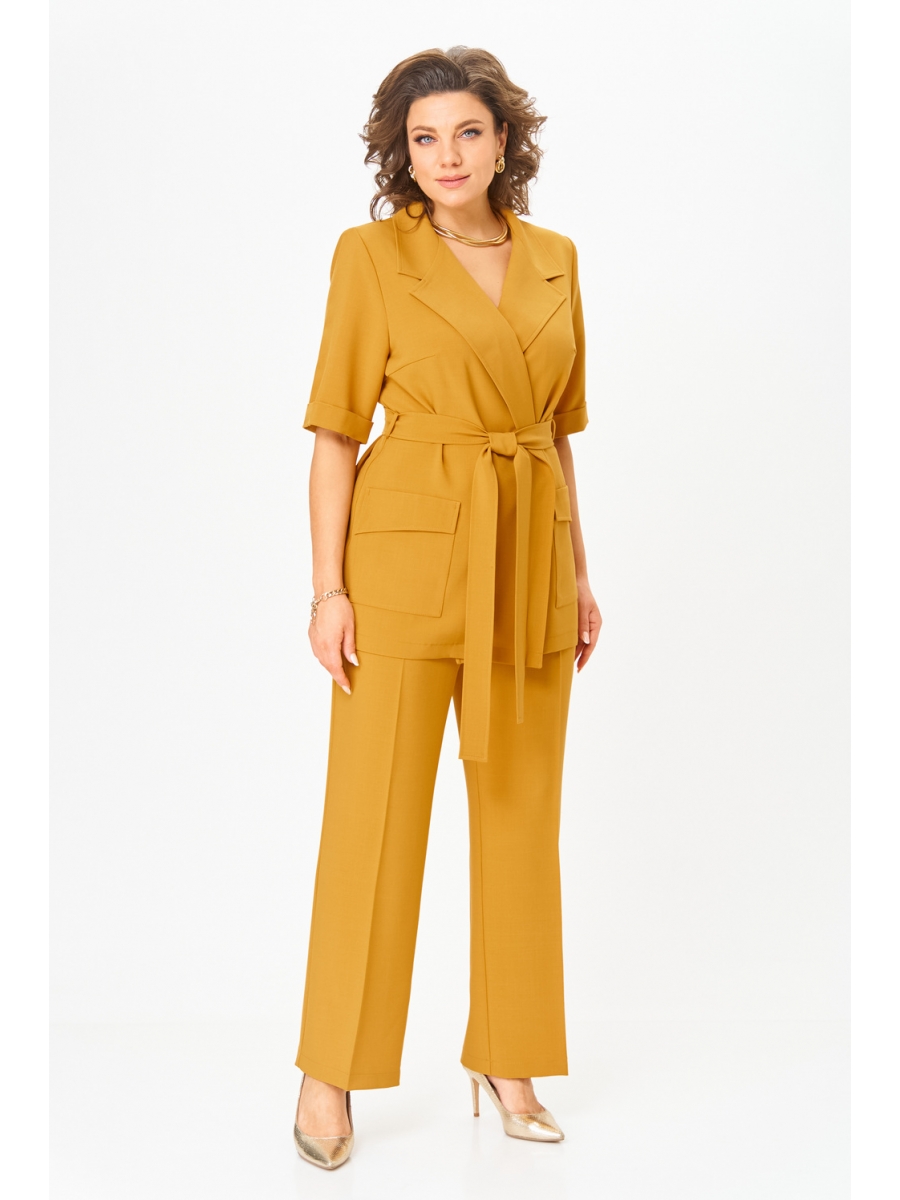 Пояс на талии подчеркивает фигуру и придает костюму женственный силуэт.