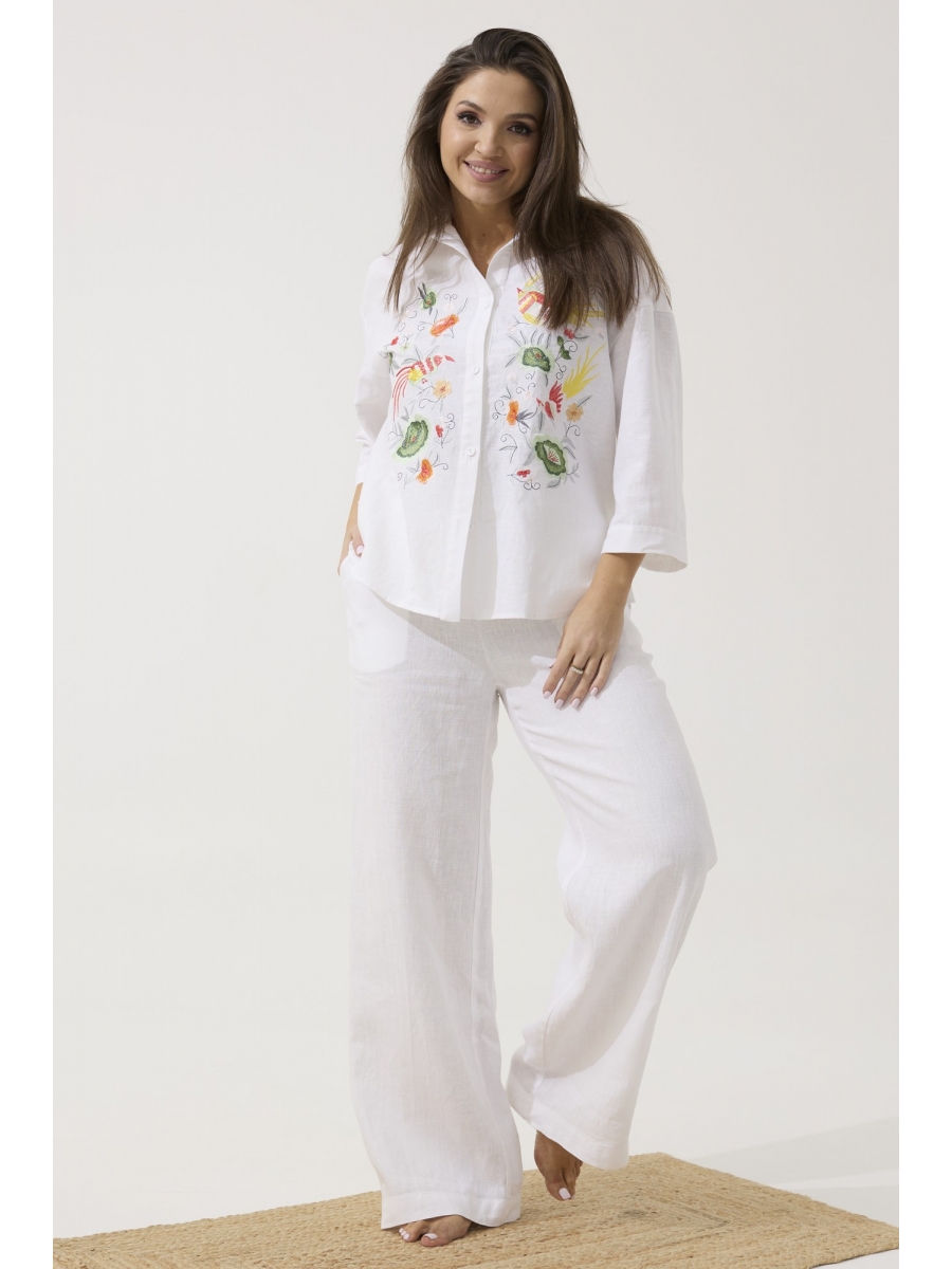 Рубашка свободного силуэта. Воротник отложной рубашечного типа. Застежка центральная на петли и пуговицы, спинка с кокеткой. На полочке расположены две симметричные дизайнерские вышивки. Рукав 3/4 со спущенной линией плеча, одношовный.