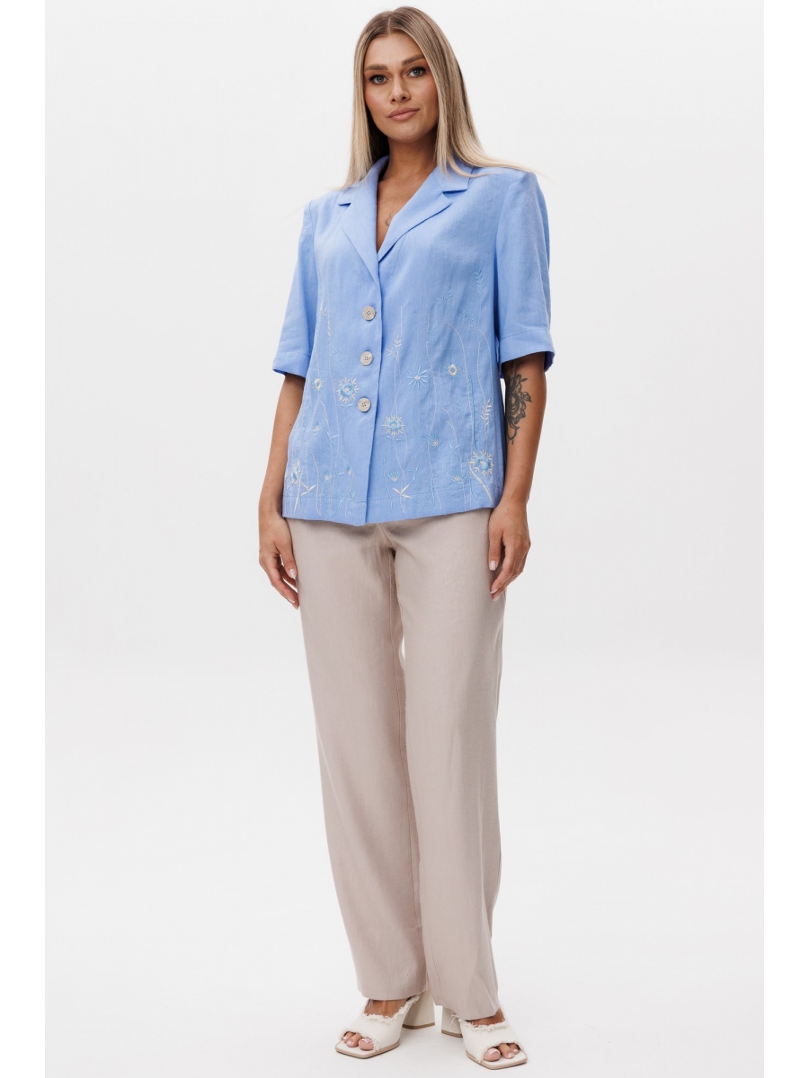 Жакет свободного силуэта. Воротник пиджачного типа, застежка центральная на три петли и пуговицы. Снизу полочки декоративная дизайнерская вышивка. Спинка со средним швом, который заканчивается шлицей. Рукав одношовный втачной, длиной по локоть.