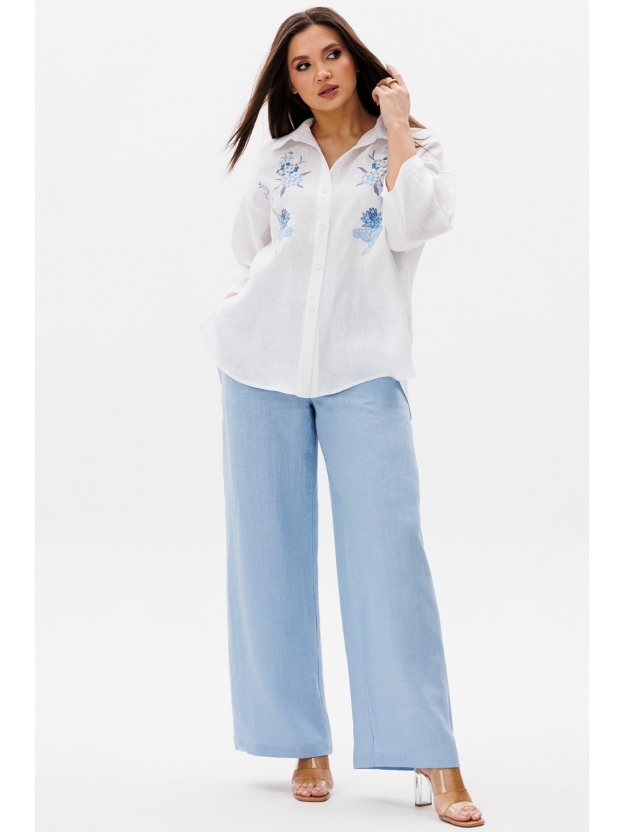 Рубашка свободного силуэта. Воротник отложной рубашечного типа. Застежка центральная на петли и пуговицы, спинка с кокеткой. На полочке расположены дизайнерские вышивки. Рукав 3/4 со спущенной линией плеча, одношовный.