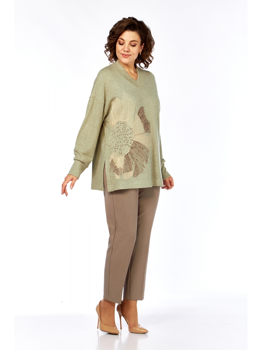 Джемпер свободного кроя, изготовлен из трикотажного полотна. Горловина V-образной формы. На полочке-вышивка. Спинка цельнокроенная. Рукава спущенные, с манжетами по низу. В боковых швах-разрезы.