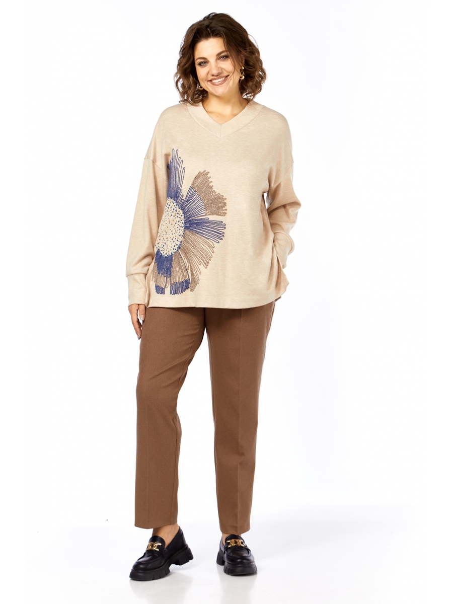 Джемпер свободного кроя, изготовлен из трикотажного полотна. Горловина V-образной формы. На полочке-вышивка. Спинка цельнокроенная. Рукава спущенные, с манжетами по низу. В боковых швах-разрезы.