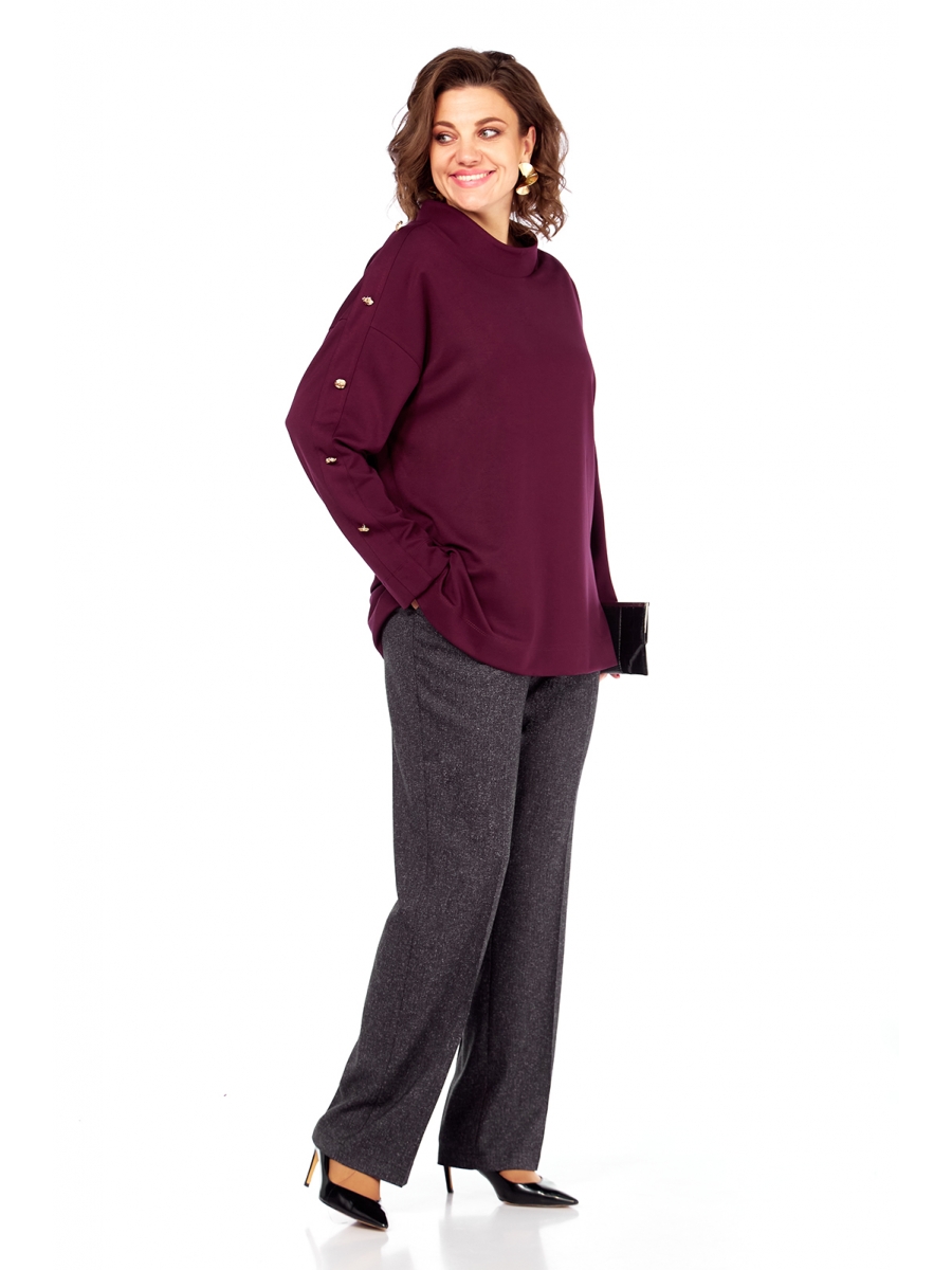 Джемпер свободного силуэта выполнен из трикотажного полотна. Перед цельнокроенный, спинка со средним швом. Рукава спущенные, от низа рукава до горловины обработана вставка, декорированная с одной стороны пуговицами. Горловина с воротником-стойка. В боковых швах разрезы.