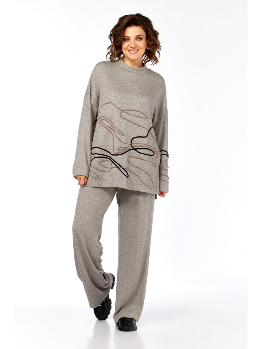 Костюм брючный двухпредметный изготовлен из трикотажного полотна. Состоит из джемпера и брюк.