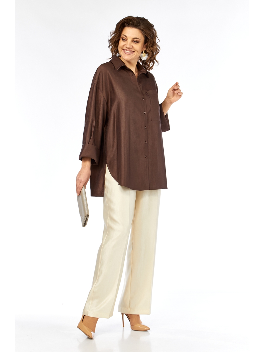 Костюм брючный двухпредметный, повседневно-нарядный, выполнен из ткани с мерцающим эффектом. Состоит из блузы и брюк.