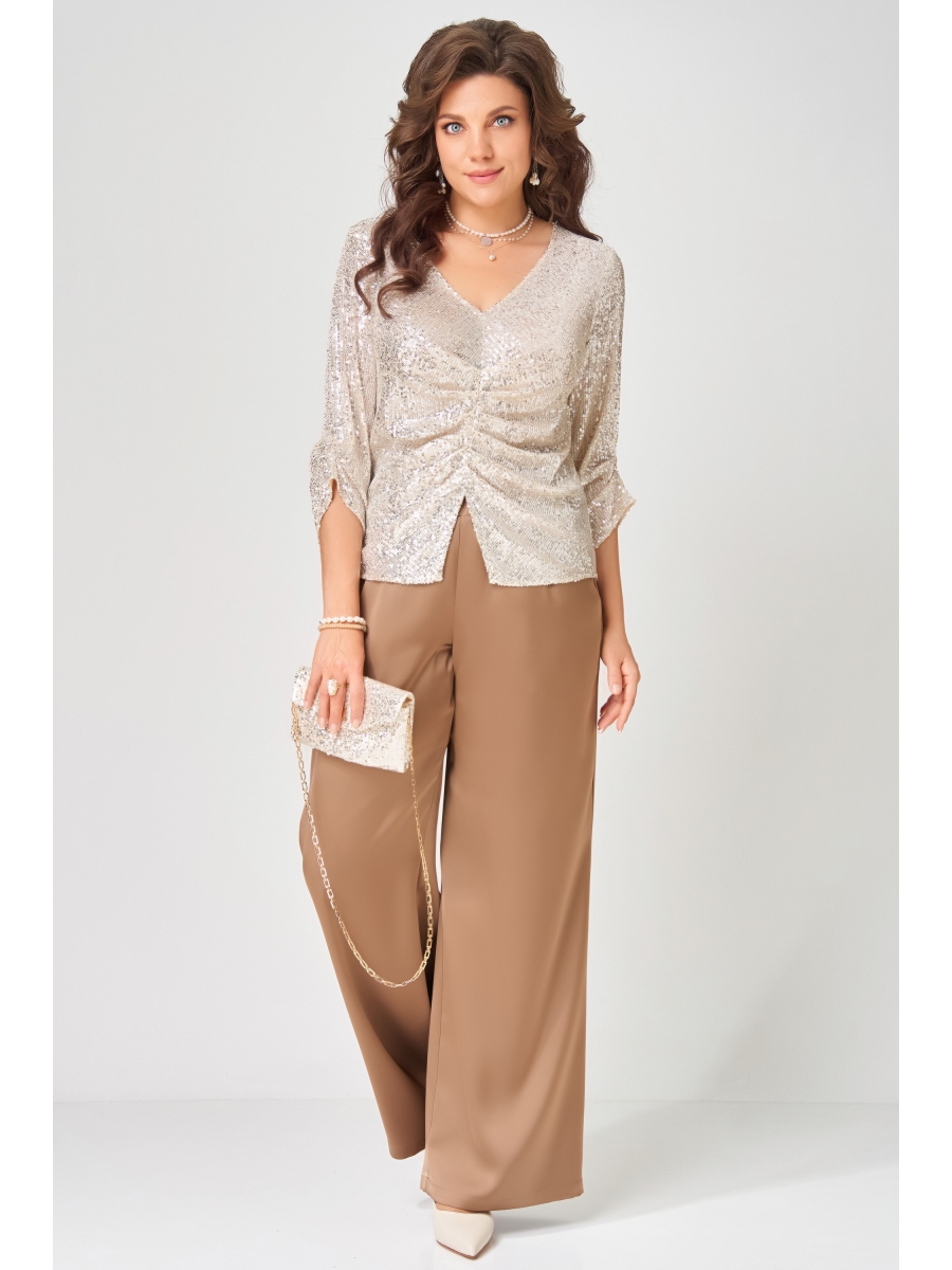 ""Зария"" — сияющий образ для особенных вечеров. Блузка, расшитая пайетками, ловит свет и восхищённые взгляды, а сатиновые брюки добавляют элегантности и свободы движения. Идеальный выбор для новогодней ночи, корпоративов и торжеств, где хочется блистать.