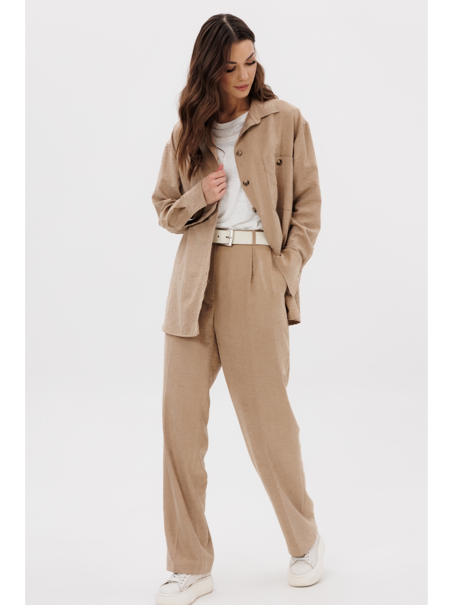 Брюки классические на притачном поясе со шлёвками с наклонными боковыми карманами. По передним половинкам брюк - мягкие складки, по задним половинкам - вытачки и прорезной карман с листочкой.