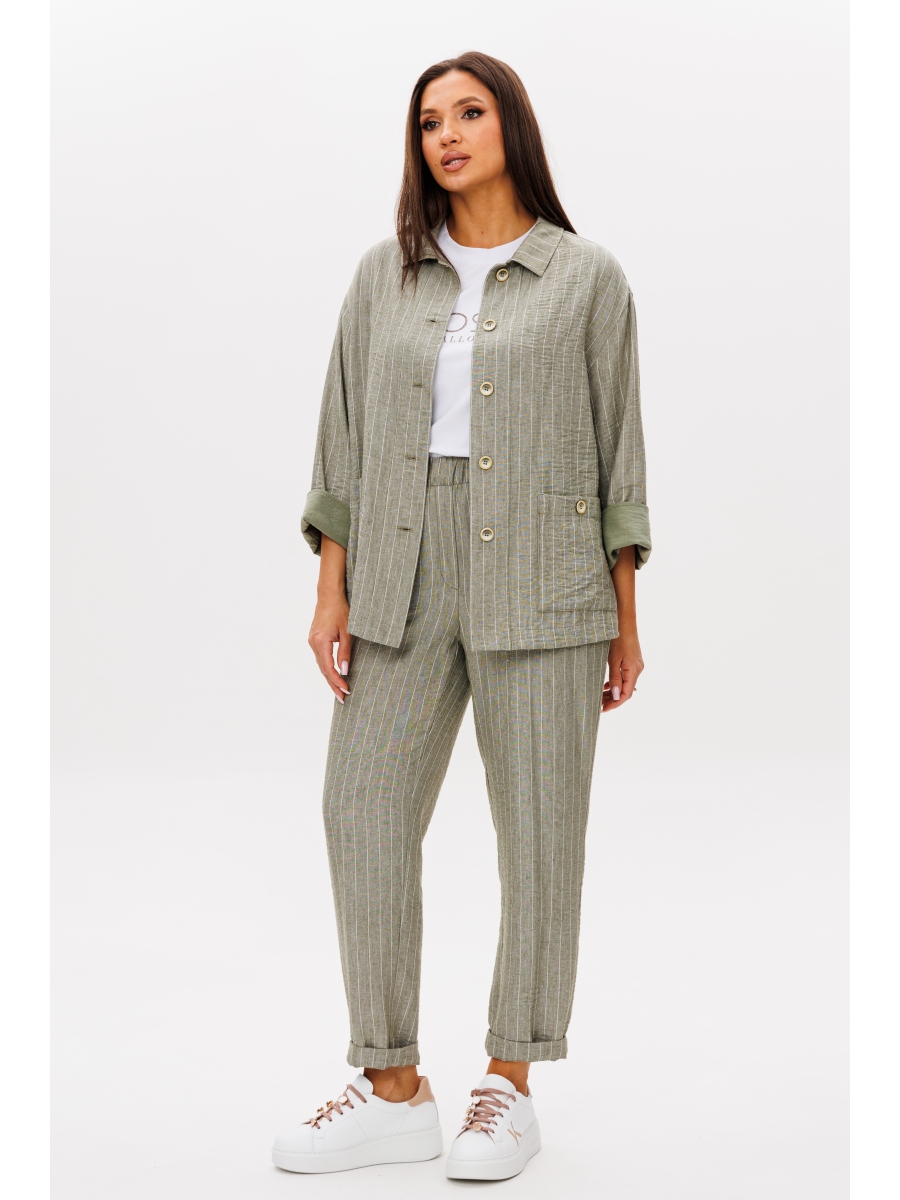 Жакет свободного упрямленного силуэта, рубашечного покроя с центральной застежкой, рубашечным рукавом и воротником, разноуровневым низом. Полочка с накладным нижним карманом. Спинка с отрезной кокеткой и легкой бантовой складкой. Рукав с отложной манжетой, по боковым швам разрезы.