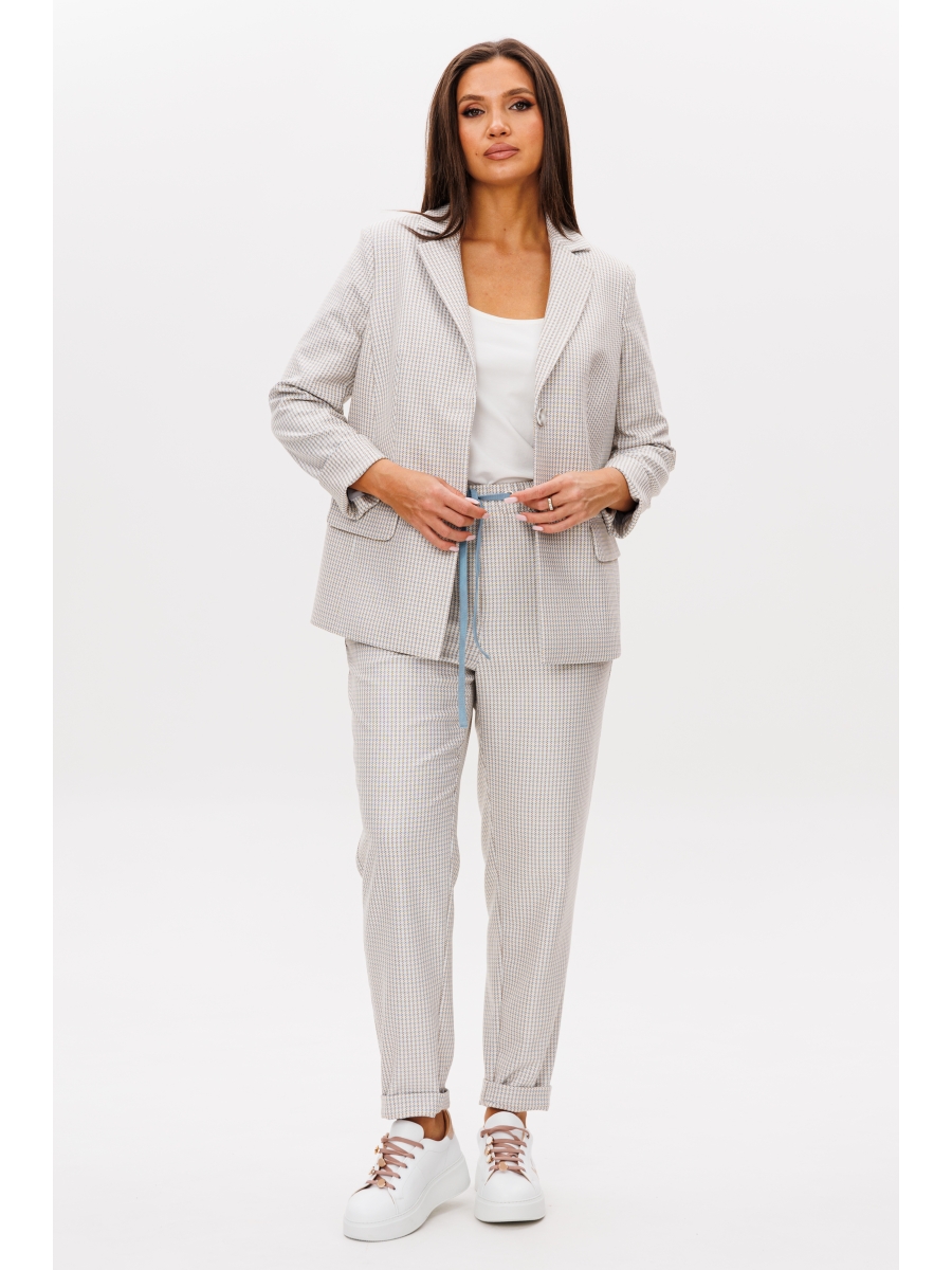 Силуэт свободный, слегка упрямлённый, покрой-втачной, воротник классический английский, линия борта фигурная, застёжка на две петли и пуговицы. Полочка с отрезным бочком, нагрудной вытачкой и прорезным карманом с клапаном. Спинка со средним швом и талиевой вытачкой. Рукав двухшовный с отлетной шлицей и отделочными пуговицами.