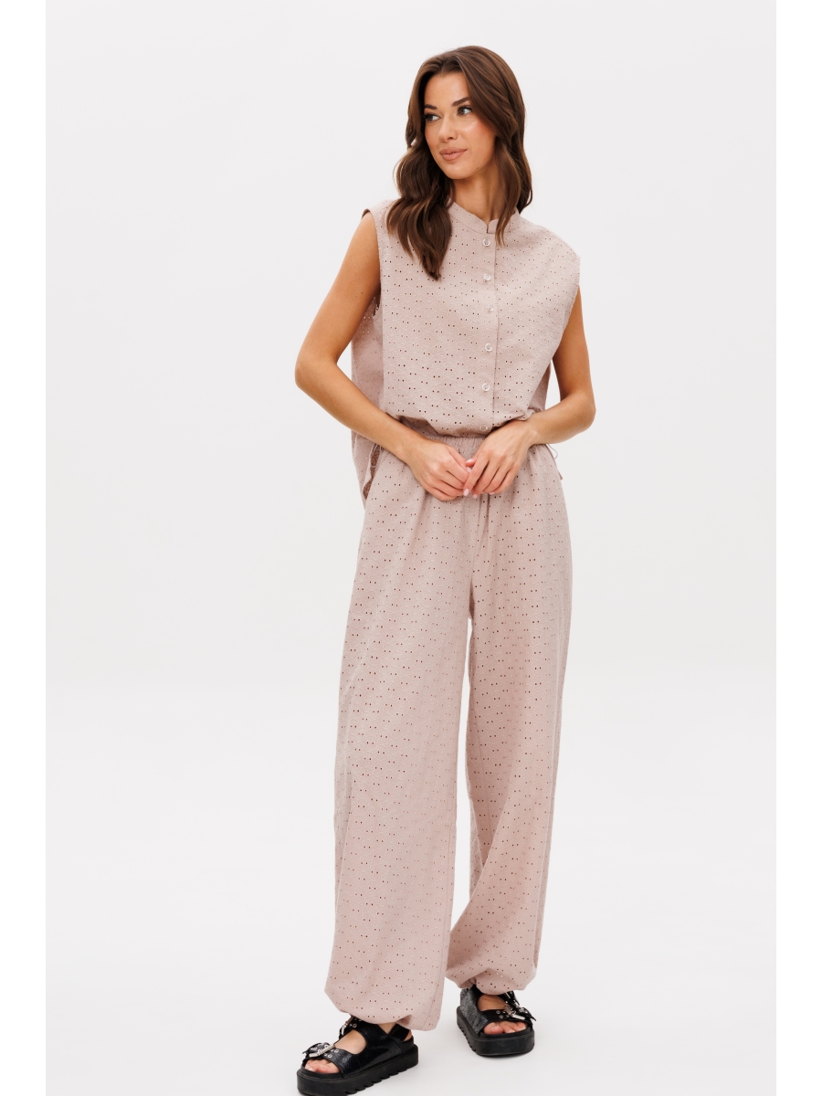 Нежный костюм из хлопкового шитья в мягком бежевом оттенке.