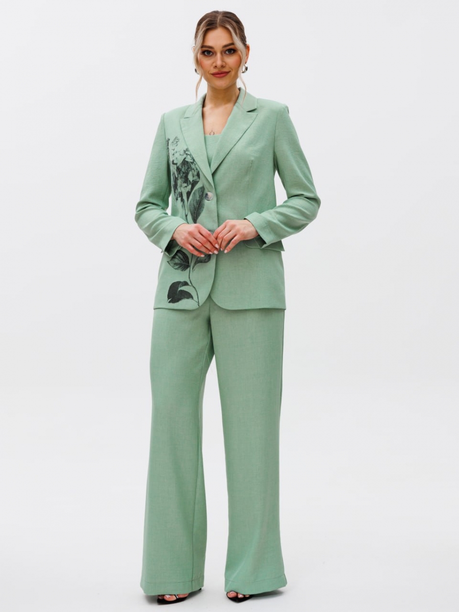 Брюки расширенные книзу с притачным поясом. По передней и задней частям брюк вытачки. По правому переду жакета выполнена декоративная печать.