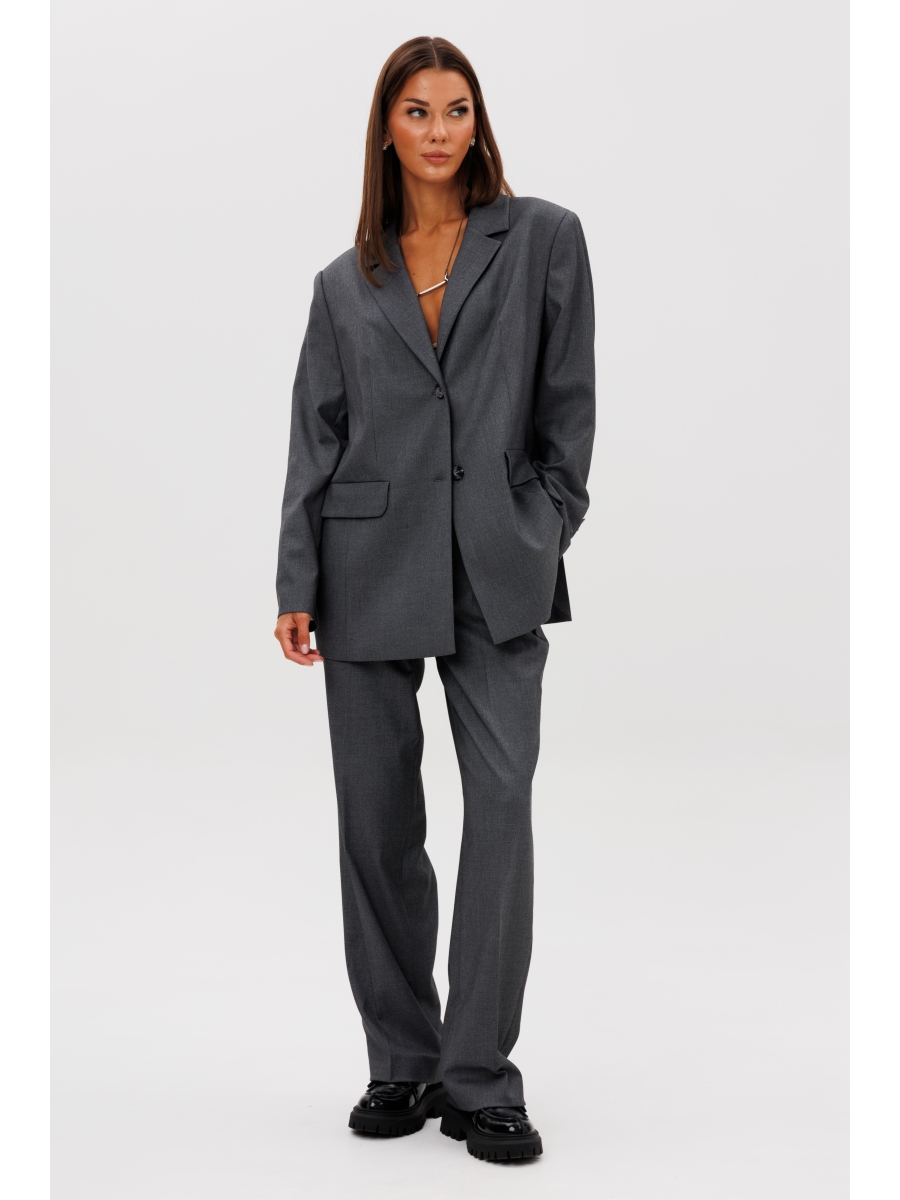 Свободный силуэт, втачной покрой, линия плеча слегка расширена, застежка центральная на 2 петли и пуговицы, воротник классический английский. Полочка с нагрудной вытачкой, прорезным карманом с клапаном и отрезным бочком. Спинка со средним швом, плечевой вытачкой, боковым рельефом и высокими шлицами в них. Рукав двухшовный с отлетной шлицей и отделочными пуговицами.