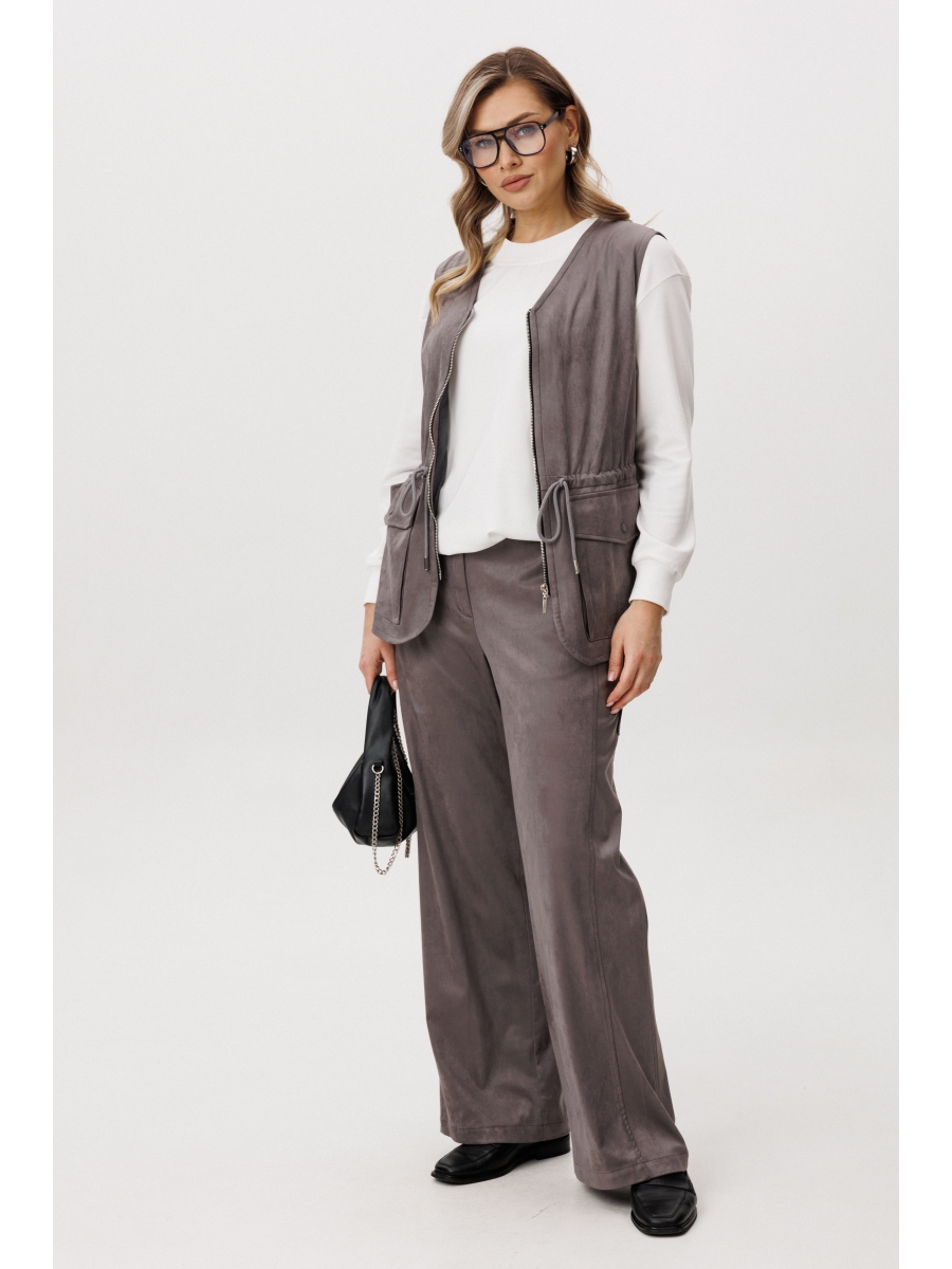 Нестандартный жилет с накладными карманами-пеналами с клапаном. Регулирующая кулиса, подчеркивающая талию. Свободный силуэт, центральная застежка на тесьму молнию, фигурная линия низа. Жилет на подкладке.