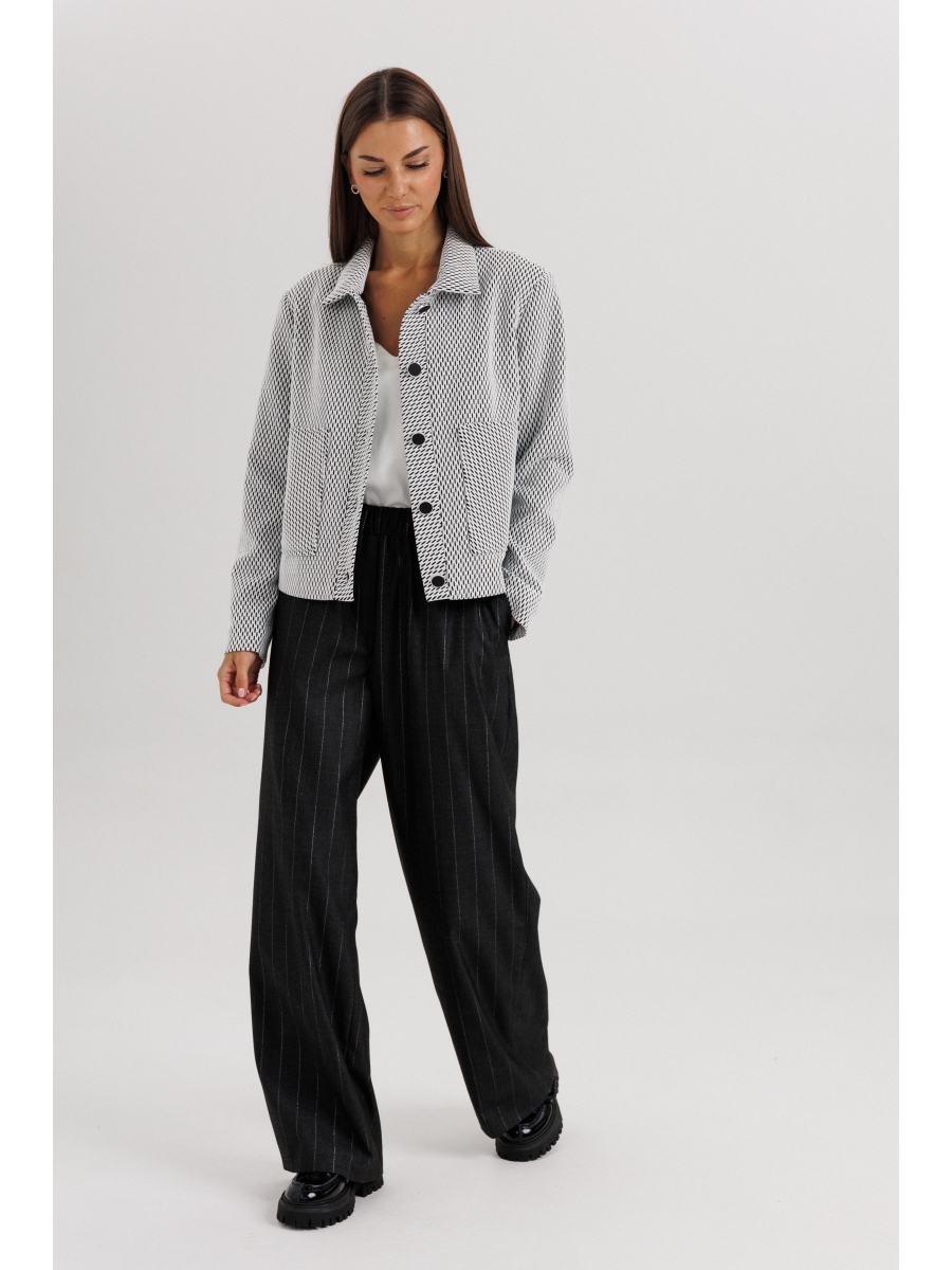 Жакет укороченной длины выполнен из лёгкой ткани с графическим узором, имеет отложной воротник и аккуратную застёжку на пуговицы.