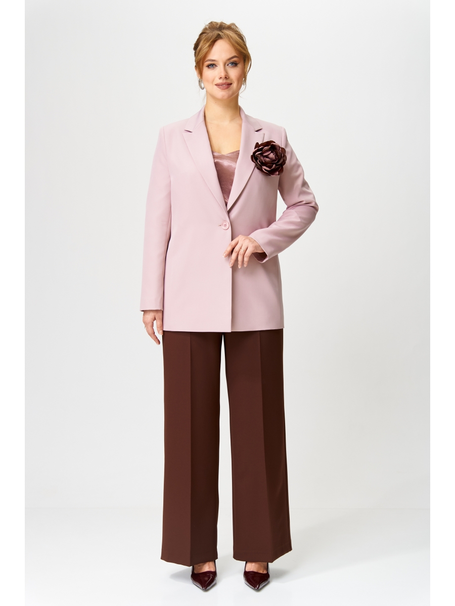 Жакет полуприлегающего силуэта из костюмной ткани с воротником пиджачного типа. Застежка однобортная на одну пуговицу. Перед и спинка с рельефами из проймы. По спинке средний шов. Рукав втачной двухшовный. Жакет на подкладке. Жакет украшает сьемная брошь цветок.
