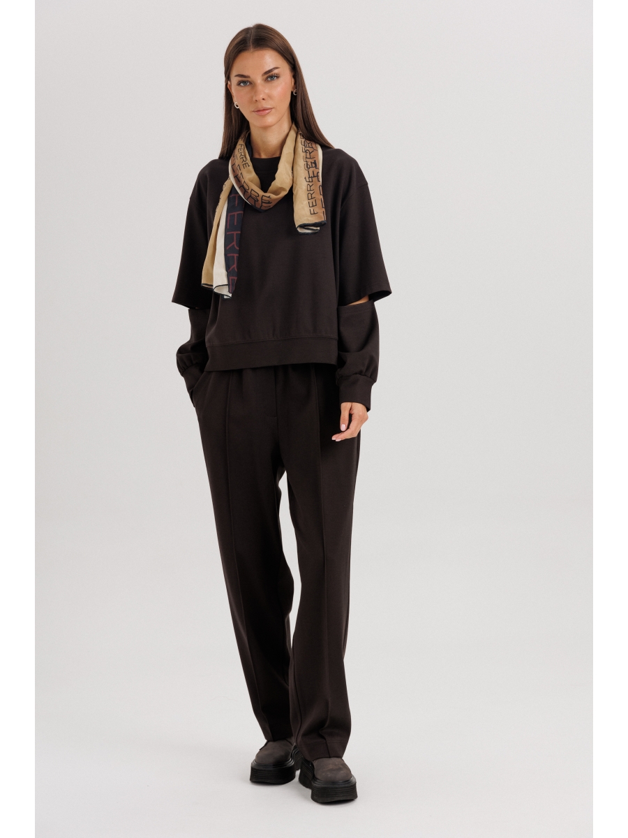 Свободный оверсайз свитшот с заниженной линией плеча, рукавом расширенным в области оката. По низу изделия и рукавов - притачной эластичный манжет. Рукав из 4-х частей с эффектным разрезом в области локтя.