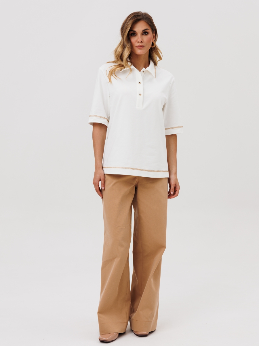 Джемпер прямого силуэта с воротником поло. Рукав втачной одношовный. По низу изделия, по низу рукава и по воротнику проложена отделочная строчка.