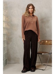 Брюки палаццо с притачным поясом из мягкой вельветовой ткани. Спереди застежка гульфик на молнии и петлей и пуговицей по поясу. По задней частям брюк вытачки. Пояс с резинкой в боковых частях. Брюки с заутюженными стрелками.