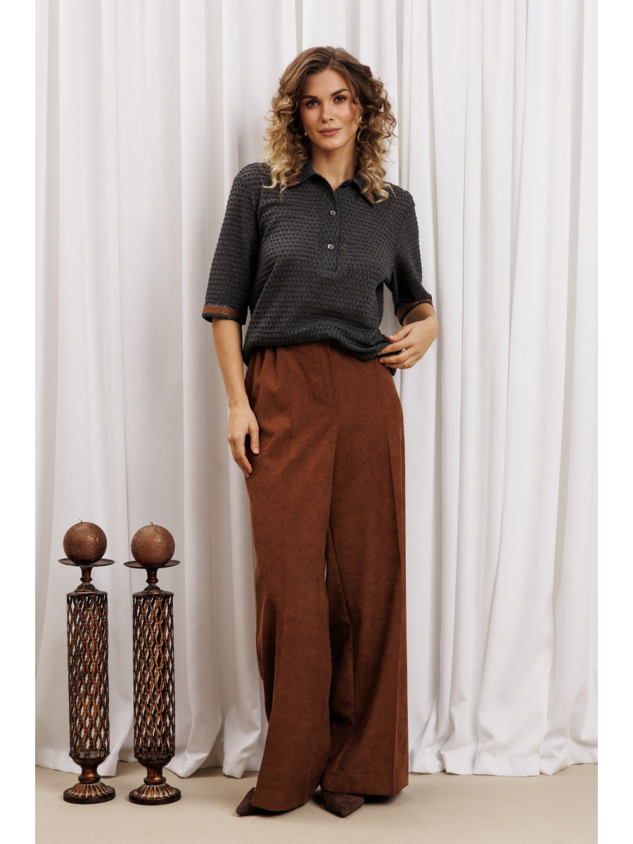 Брюки палаццо с притачным поясом из мягкой вельветовой ткани. Спереди застежка гульфик на молнии и петлей и пуговицей по поясу. По задней частям брюк вытачки. Пояс с резинкой в боковых частях. Брюки с заутюженными стрелками.