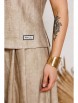 Блуза прямого силуэта, выполнена из вискозной ткани с добавлением хлопка с эффектом жатки, что придаёт изделию особый стиль. Блуза с нагрудными выточками, спущенным рукавом с манжетой, по бокам с небольшими разрезами (разрез 9 см). Перед блузки декорирован пришивной дизайнерской нашивкой.