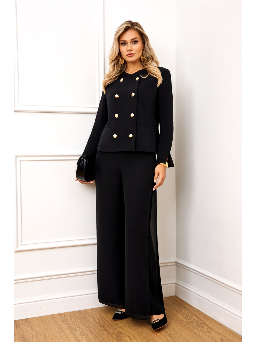 Брюки прямого силуэта, выполнены из ткани Зара с добавлением вискозы, верхний слой брюк выполнен из летящего шифона, что придает модели особый стиль и нарядность. Брюки сбоку с застежкой на потайную молнию и пуговицы.