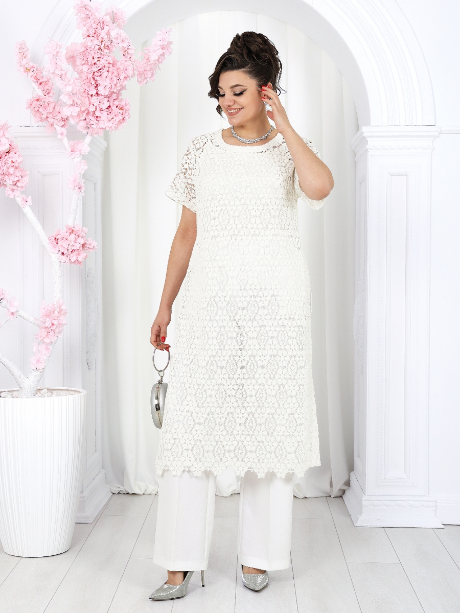 Туника полуприлегающего силуэта, выполнена из хлопкового кружева. Модель без застежки, без плечевых накладок, с высокими (от талии) разрезами в боковых швах. С изнанки разрезы обработаны хлопковой тесьмой в цвет кружева, закрепленной с лицевой стороны отделочной строчкой шириной 3 см. Круглый вырез горловины переда и спинки обработан обтачкой из костюмно-плательной ткани в цвет кружева; ширина отделочной строчки по горловине 2 см. Рукав втачной, короткий. Длина туники – 117 см; длина рукава – 22 см.