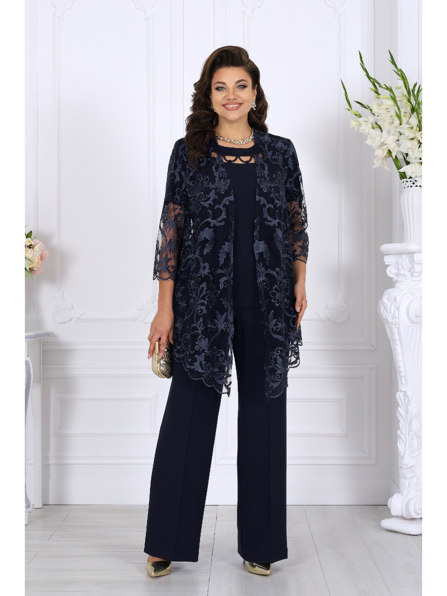 Комплект состоит из трёх предметов: изысканного кардигана из гипюра, мягкой трикотажной блузки и классических брюк со стрелками. Такой ансамбль выглядит нарядно, подчеркивает женственность и формирует правильный силуэт даже для фигур plus size.