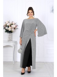 Туника полуприлегающего силуэта с расширением к низу, выполнена из трикотажного полотна с фактурной лицевой стороной «люрекс». Модель отрезная по линии талии; верхняя часть переда и спинки (лиф) на трикотажной подкладке. Лиф переда с одним рельефным швом, направленным от левой проймы; нижняя часть переда состоит из двух деталей, скрепленных на запах. По линии талии, вдоль рельефа, перед задрапирован сборкой и односторонними складками. На спинке обработаны талиевые вытачки и средний шов с застежкой на потайную тесьму-«молнию» (50 см). Вырез горловины спинки и переда формы «лодочка». Рукав без шва, с отлетными краями; крепится к пройме только в верхней части. Длина туники – 139 см; длина рукава – 51 см.