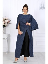Туника полуприлегающего силуэта с расширением к низу, выполнена из трикотажного полотна с фактурной лицевой стороной «люрекс». Модель отрезная по линии талии; верхняя часть переда и спинки (лиф) на трикотажной подкладке. Лиф переда с одним рельефным швом, направленным от левой проймы; нижняя часть переда состоит из двух деталей, скрепленных на запах. По линии талии, вдоль рельефа, перед задрапирован сборкой и односторонними складками. На спинке обработаны талиевые вытачки и средний шов с застежкой на потайную тесьму-«молнию» (50 см). Вырез горловины спинки и переда формы «лодочка». Рукав без шва, с отлетными краями; крепится к пройме только в верхней части. Длина туники – 139 см; длина рукава – 51 см.