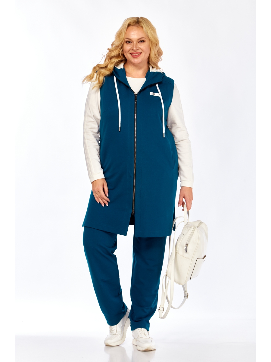 Стильный женский комплект состоит из жилета, брюк и блузы.