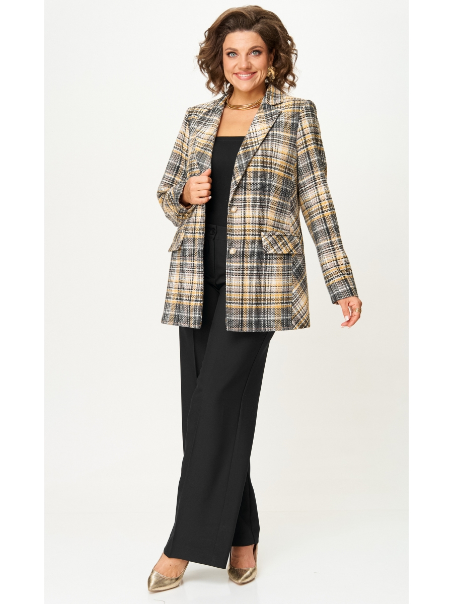 Жакет удлиненный, свободного силуэта с центральной бортовой застежкой на пуговицы до линии перегиба лацкана. По переду имеется отрезной бочок и вертикальные вытачки. С прорезными карманами с клапаном и двумя обтачками. Спинка цельная. Воротник пиджачного типа. Рукав двухшовный, втачной. Жакет на подкладке.