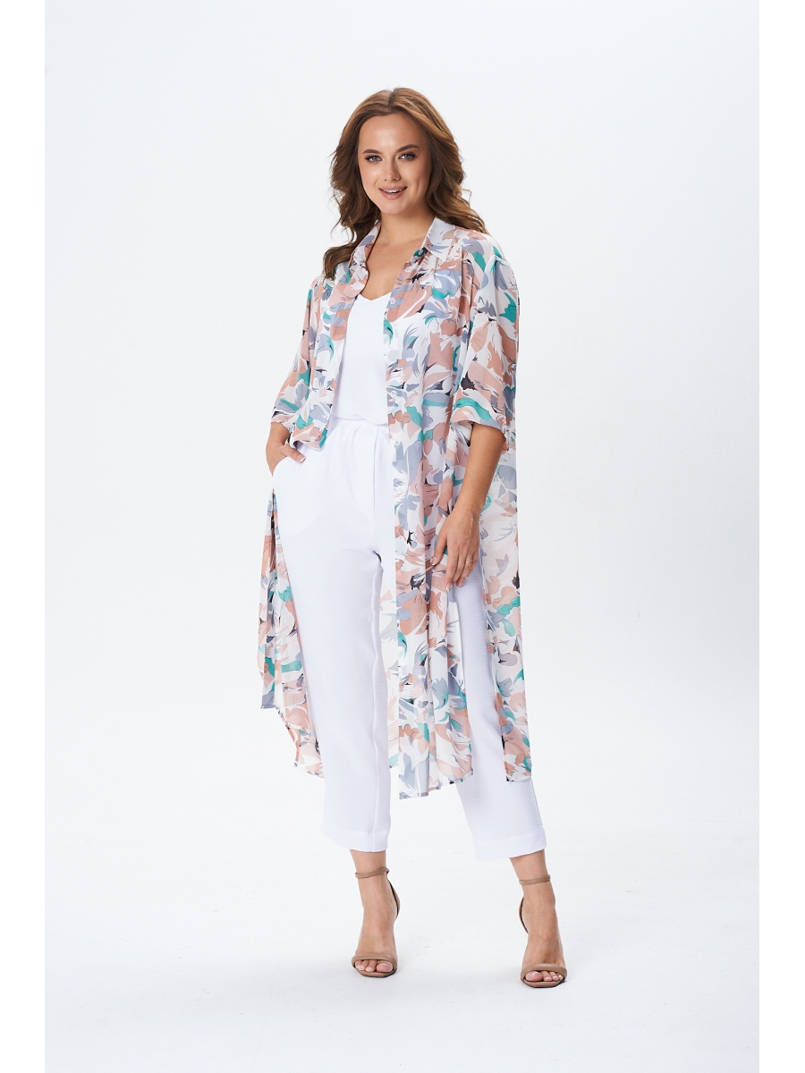 Шазюбль прямого силуэта свободного покроя из плательно-блузочной ткани шифон с принтом. По переду центральная застежка на петли и пуговицы, нагрудные вытачки из проймы, в боковых швах высокие разрезы. По спинке кокетка, складка. Воротник рубашечный на стойке. Рукав втачной, линия плеча спущена.